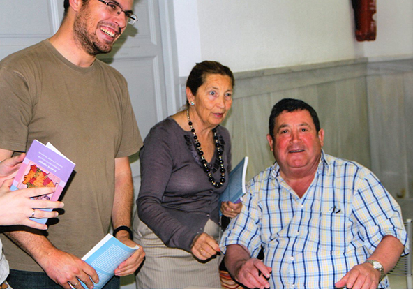 Leonardo Villena le entrega la sra presidenta del Centro Artistico de Granada un lote de sus libros».